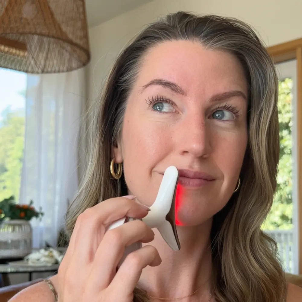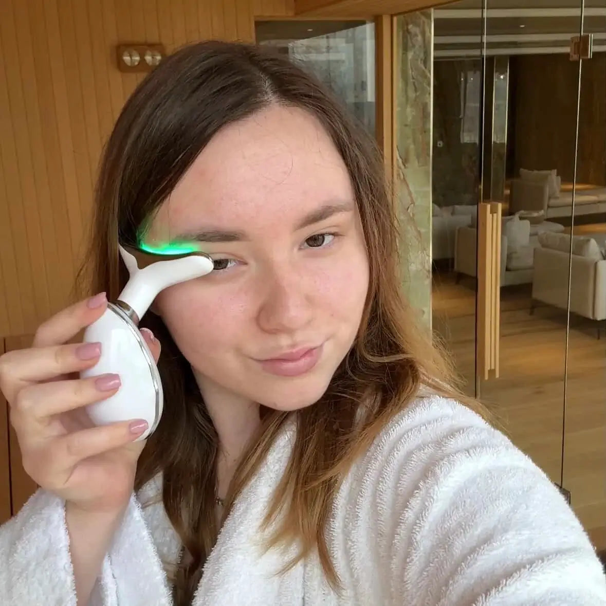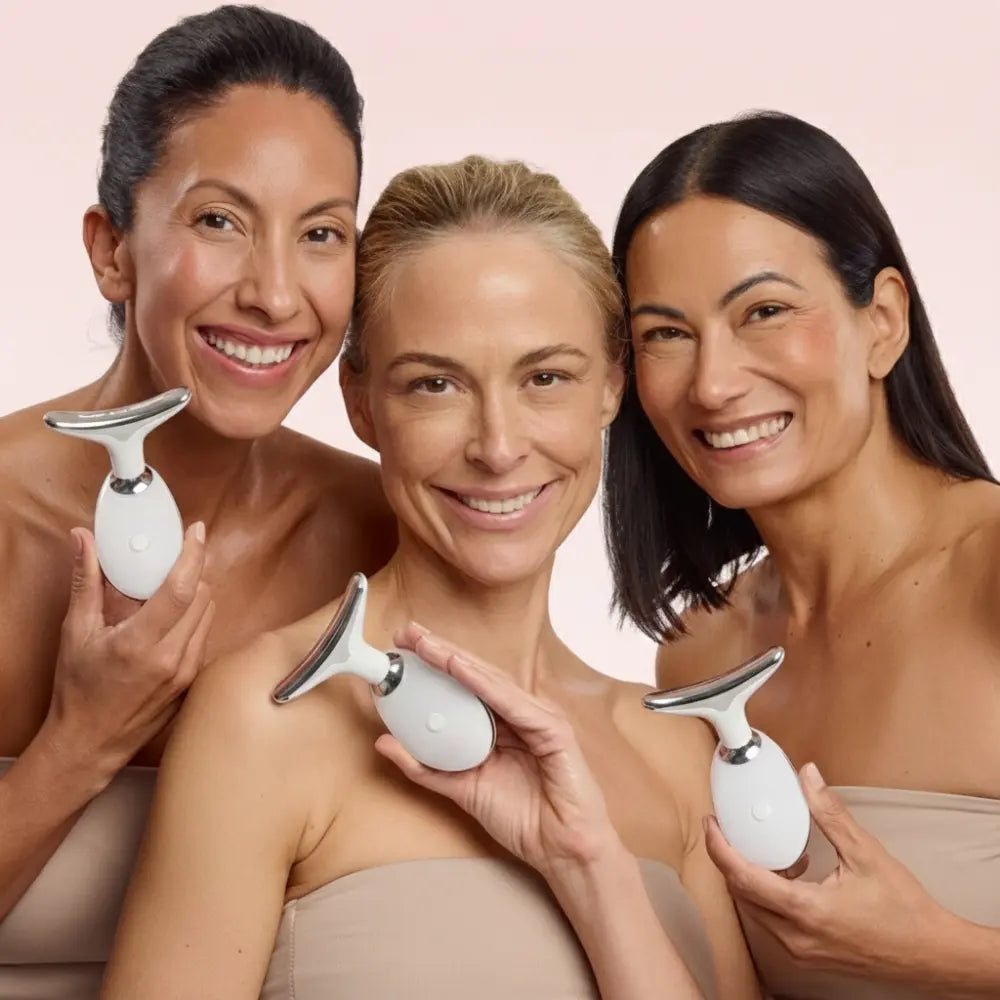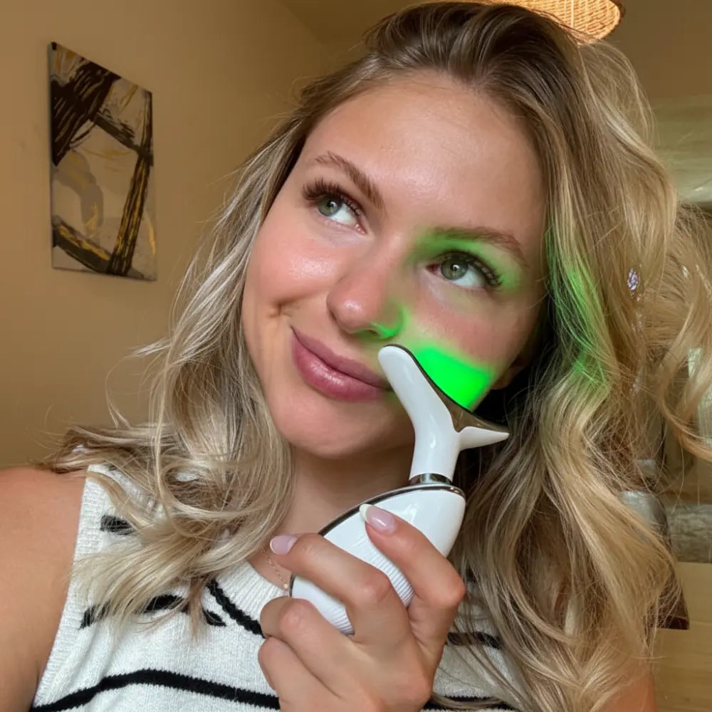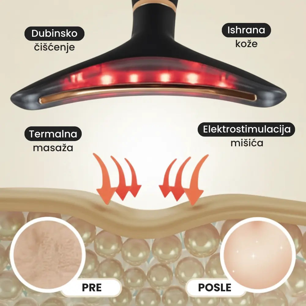 Ovo je 5-u-1 uređaj koji kombinuje EMS, mikrostruju, LED terapiju, toplotu i vibraciju. Deluje ispod površine kože, aktivira mišiće lica i podstiče prirodnu proizvodnju kolagena i elastina za zategnutiji izgled.